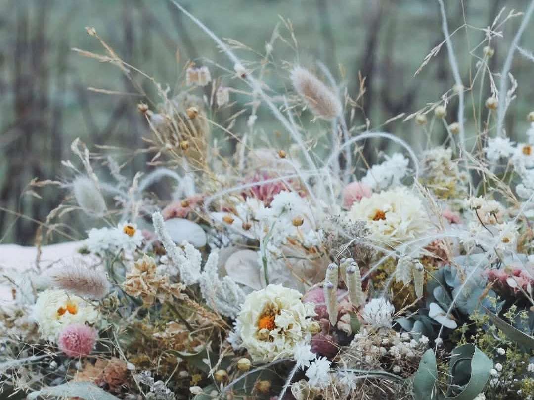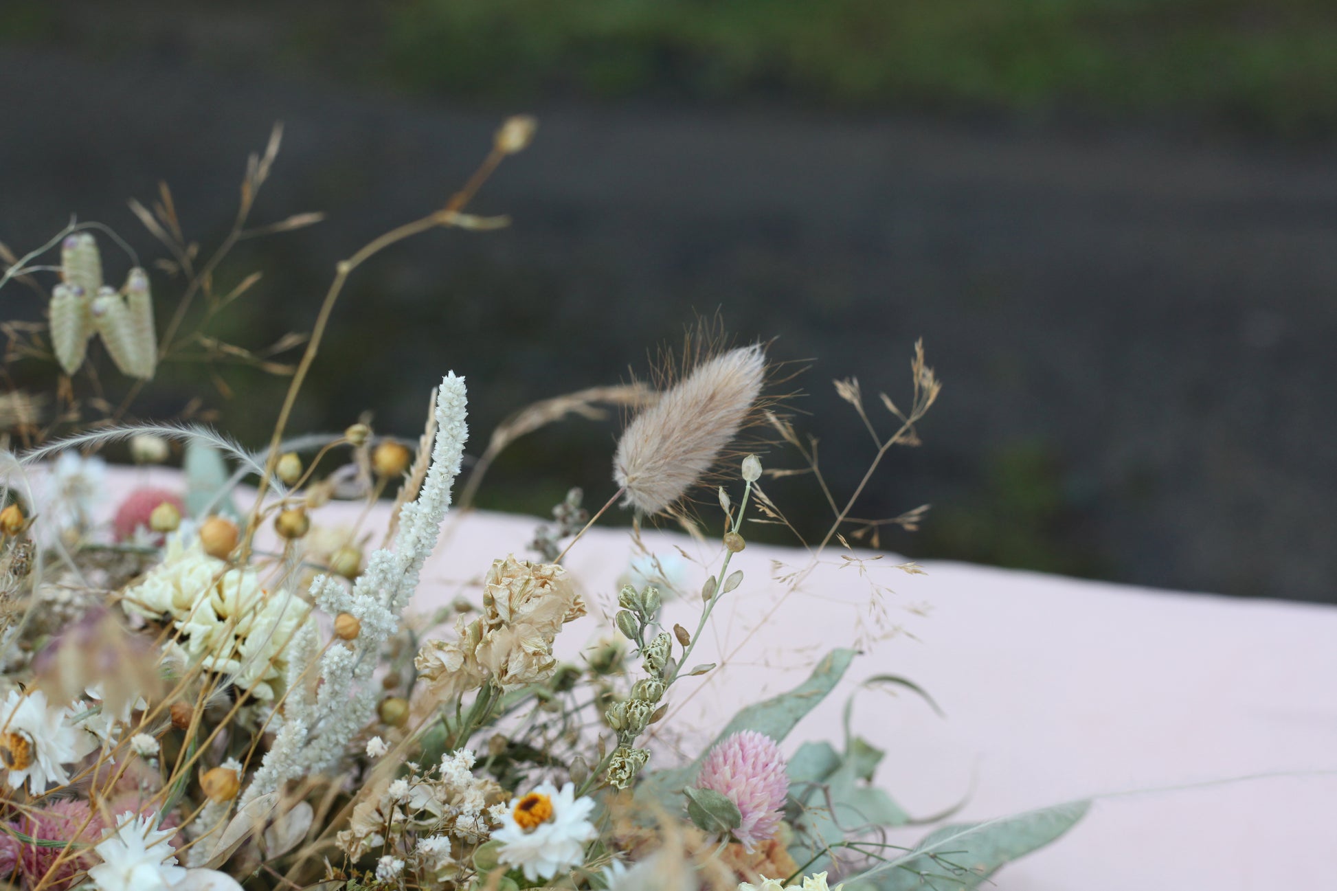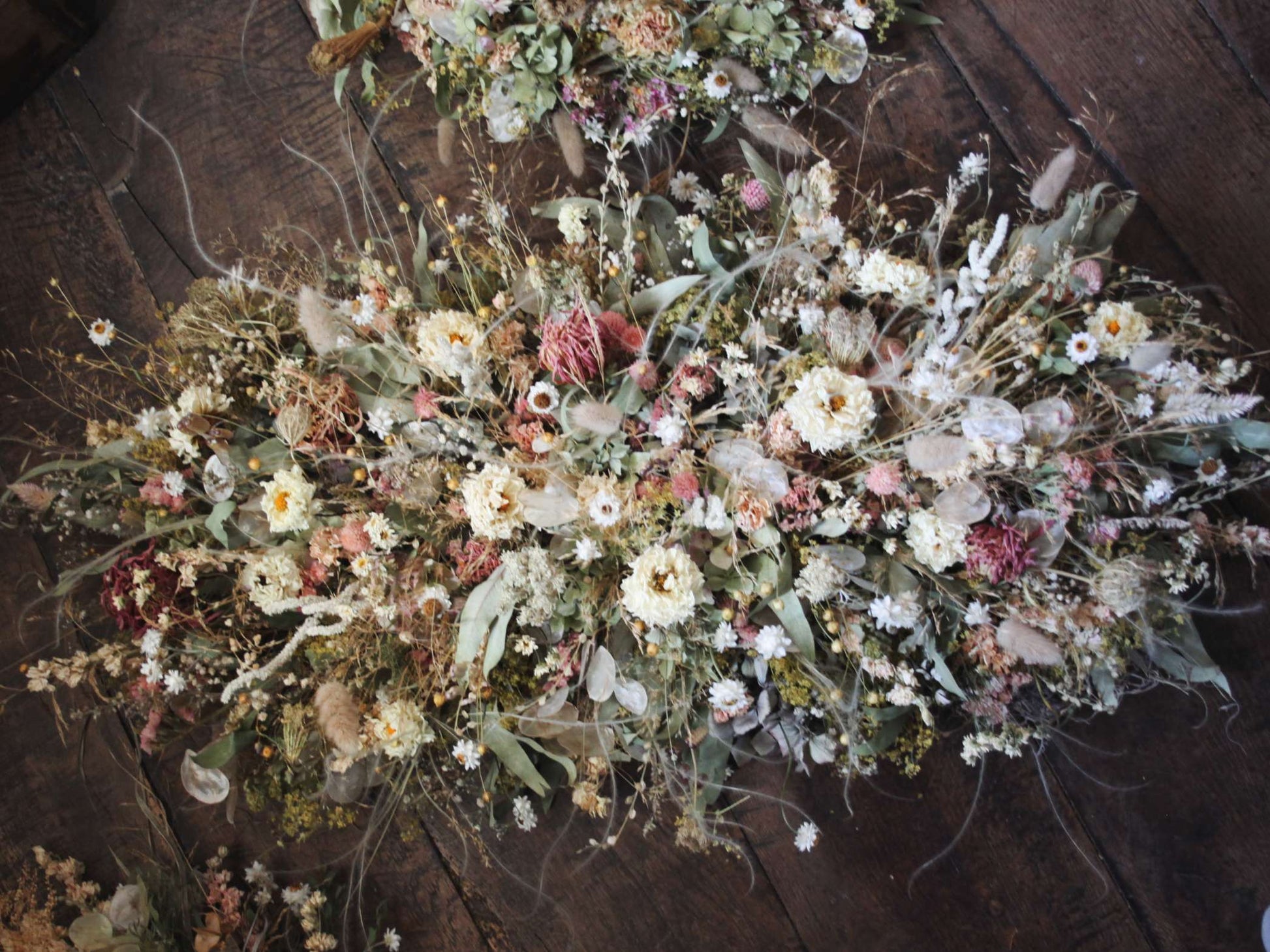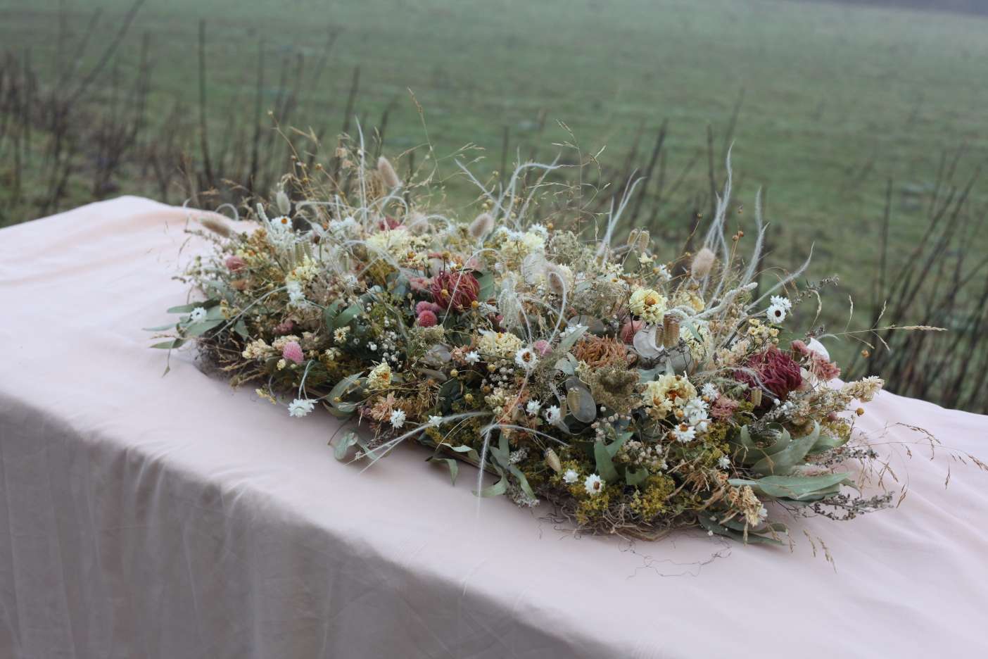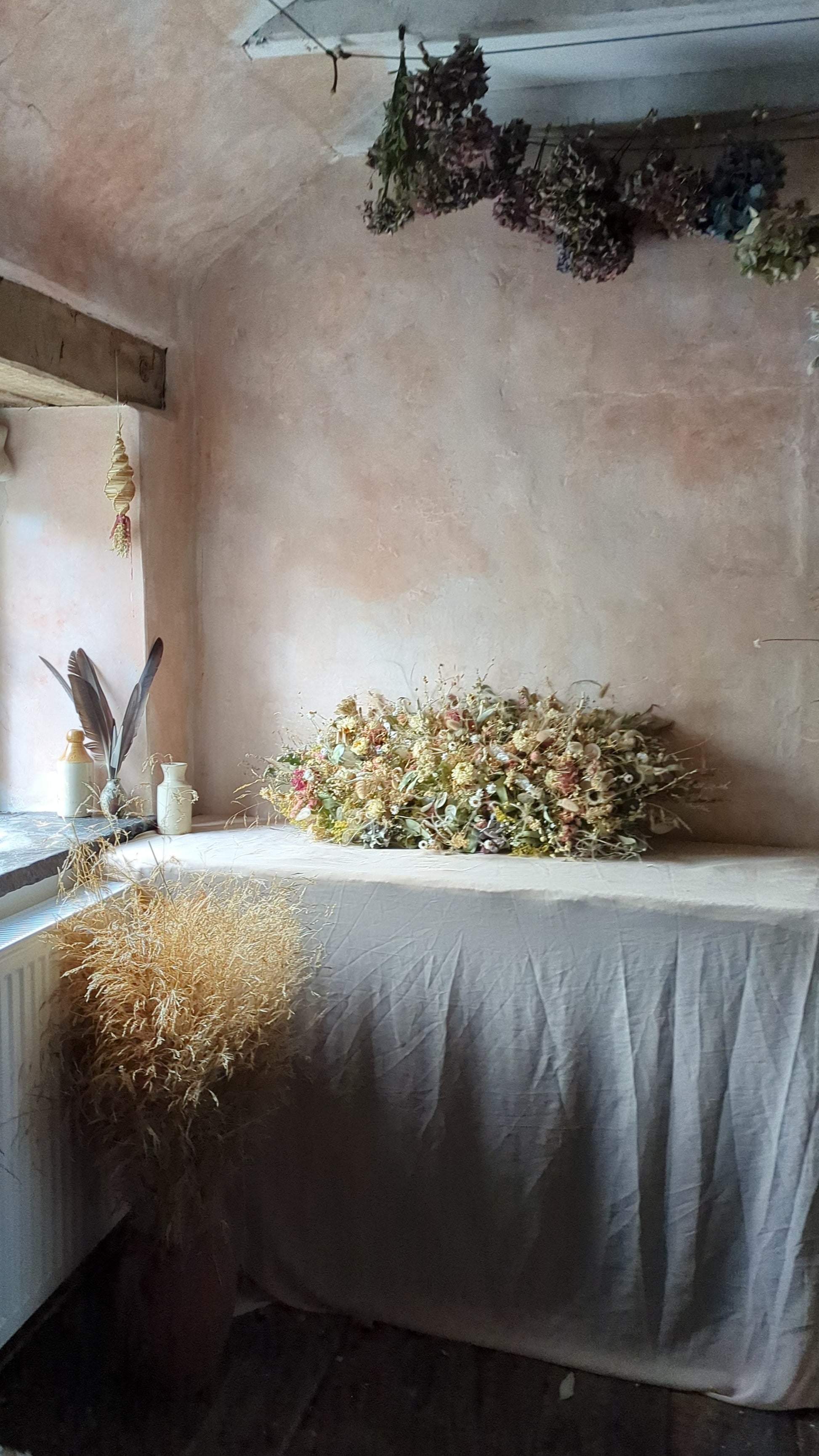 This casket spray measures approximately 90cm in length and 40cm in width. Made with a carefully chosen selection of plants grown and dried in my home in the Dyfi Valley, along with flowers from my mum's plot, its complementary colour palette and delicate textures come together to create a tribute that is soft and ethereal.